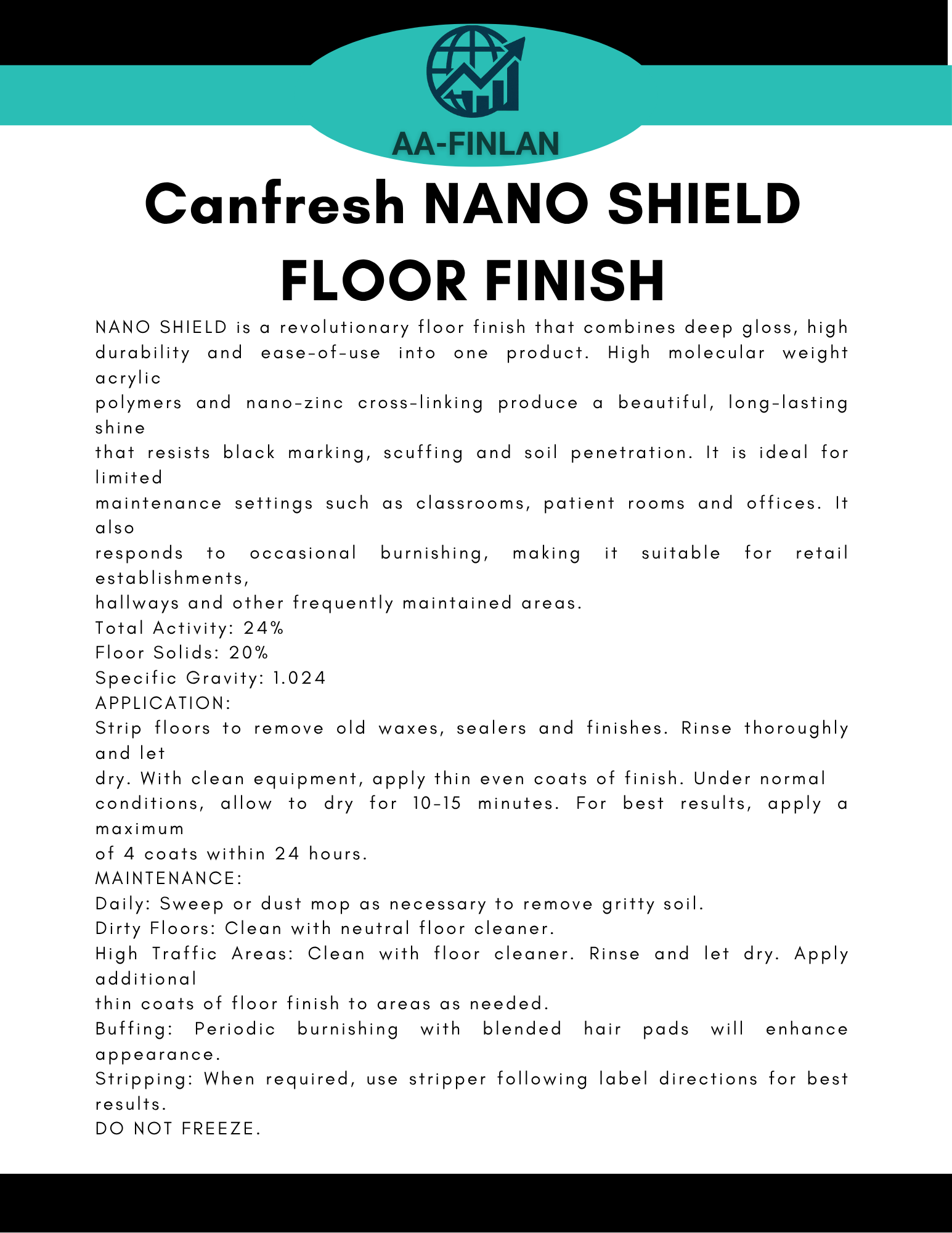 NANO SHIELD is a revolutionary floor finish that combines deep gloss, high durability and ease-of-use into one product. High molecular weight acrylic polymers and nano-zinc cross-linking produce a beautiful, long-lasting shine that resists black marking, scuffing and soil penetration. It is ideal for limited maintenance settings such as classrooms, patient rooms and offices. It also responds to occasional burnishing, making it suitable for retail establishments,