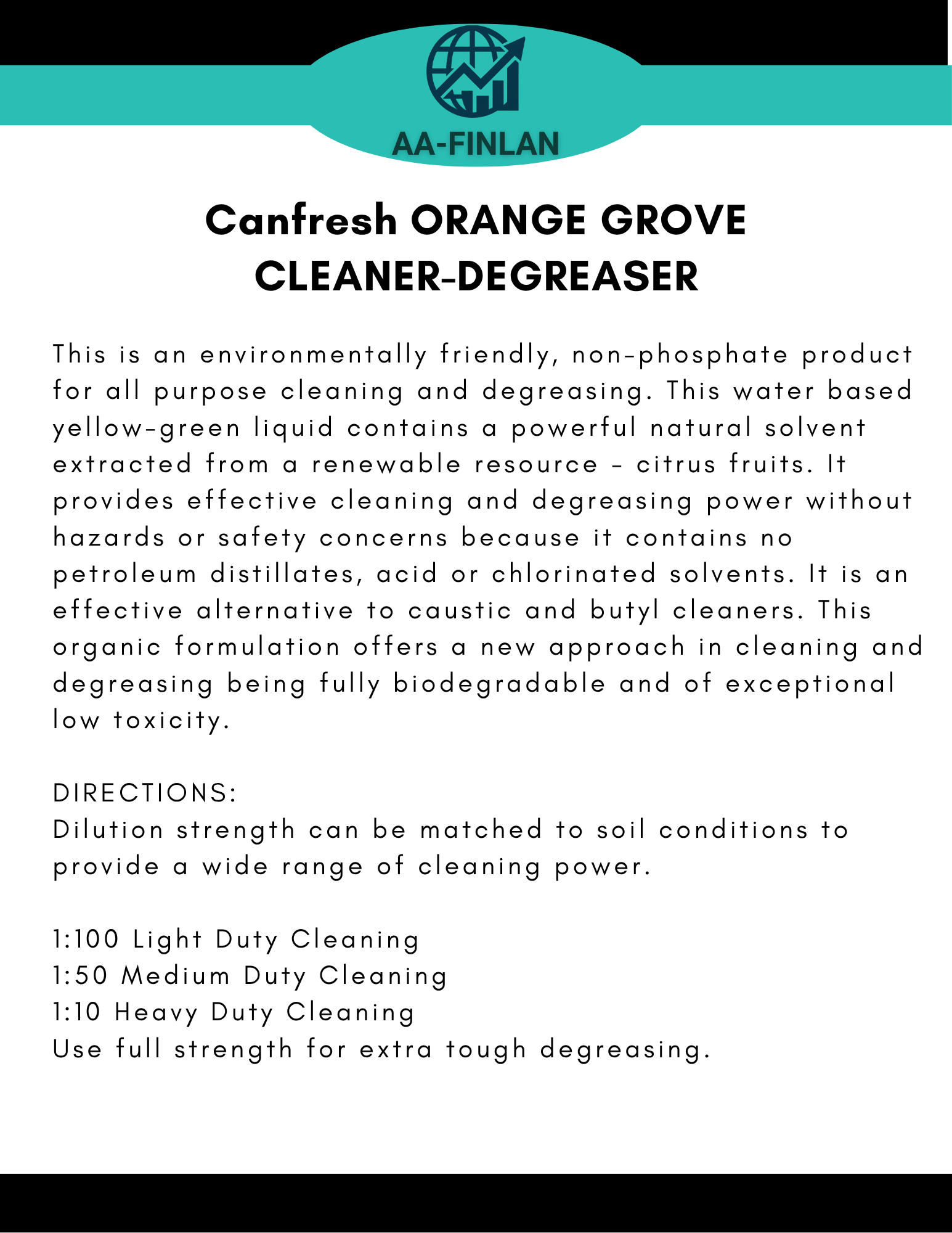 This is an environmentally friendly, non-phosphate product for all purpose cleaning and degreasing. This water based yellow-green liquid contains a powerful natural solvent extracted from a renewable resource - citrus fruits. It provides effective cleaning and degreasing power without hazards or safety concerns because it contains no petroleum distillates, acid or chlorinated solvents. It is an effective alternative to caustic and butyl cleaners. This organic formulation offers a new approach in cleaning and degreasing being fully biodegradable and of exceptional